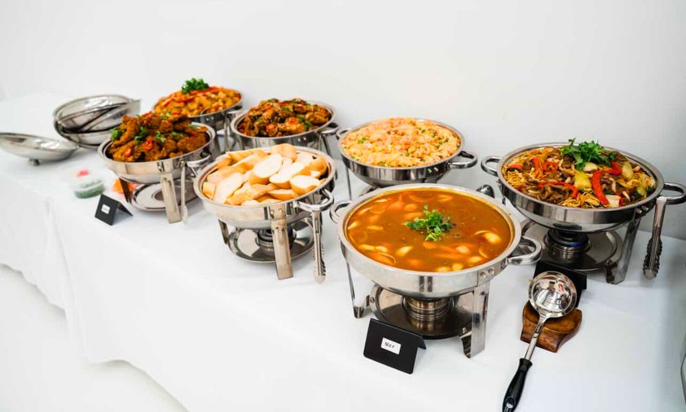 A strong wedding buffet display uses platters, risers, linen, florals, labels and hot-holding equipment where needed. Stainless chafing dishes or bain-marie style equipment help keep hot items serviceable, while clear plate access, serving utensils, napkins, water points and balanced visual styling improve the whole guest experience. Staffing levels should match service style, not guesswork.
